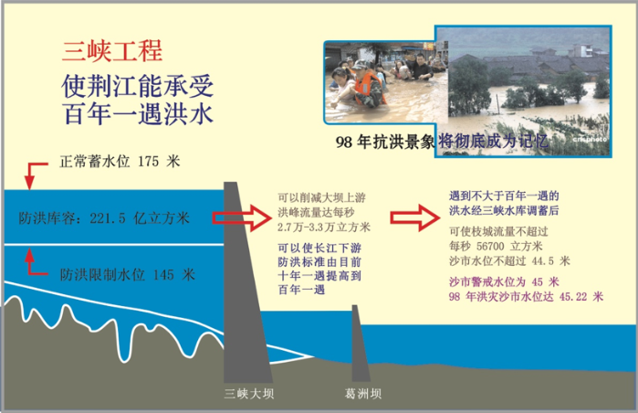 如果沒有三峽工程,荊江河段若遭遇類似歷史上出現(xiàn)過的1860、1870年特大洪水,兩岸堤防將潰決,洪水直趨洞庭湖,淹沒江漢平原,直接危及武漢市和京廣鐵路的安全,沖毀沿線鄉(xiāng)村、城鎮(zhèn)和工礦企業(yè),勢(shì)必造成大量人員傷亡和巨大經(jīng)濟(jì)損失。為了消除中華民族的心腹大患,因此將防洪功能作為三峽工程的首要功能。