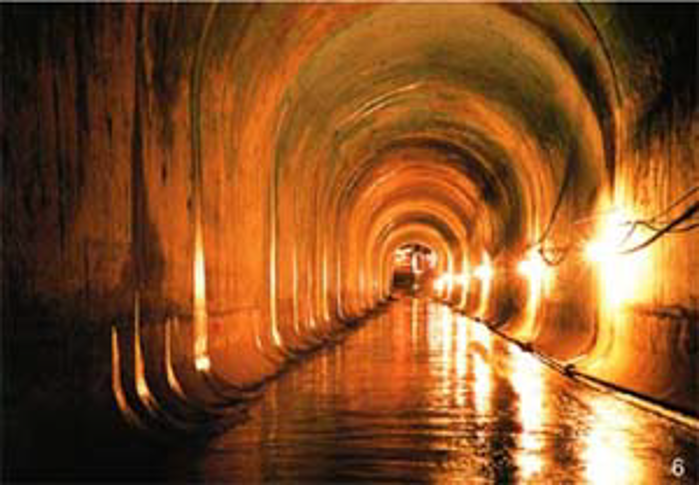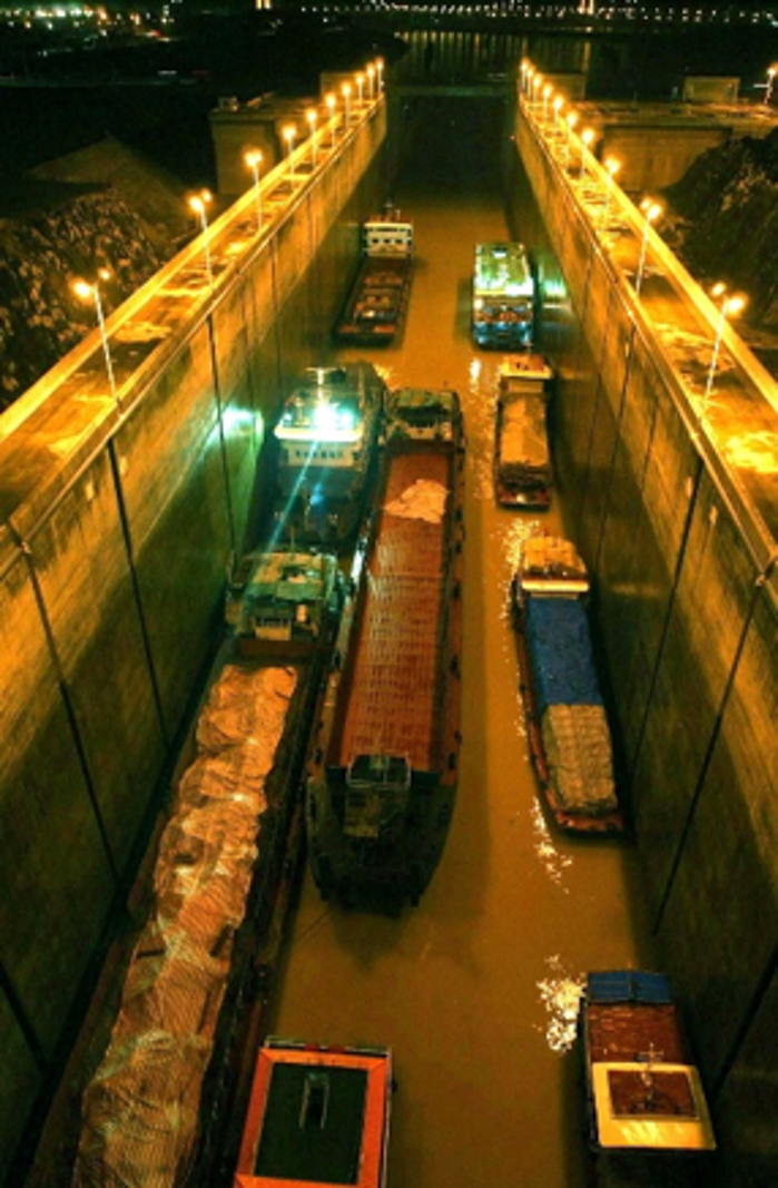 假如船舶要從下游駛向上游——船舶駛?cè)氲谖彘l室后,關(guān)閉下游人字門,通過地下輸水系統(tǒng),第四閘室往第五閘室內(nèi)充水,當兩個閘室內(nèi)水面齊平時,打開上游人字門,船舶駛?cè)氲谒拈l室。依此類推,船舶就好像爬過一級又一級樓梯一樣,通過第一閘室,駛向大壩上游航道。船舶下行的過程相反。三峽船閘單個閘室凈寬34米、長280米,是世界上最大的閘室,可同時容納6艘3000噸級船舶。一艘船通過三峽船閘大約要3個小時。