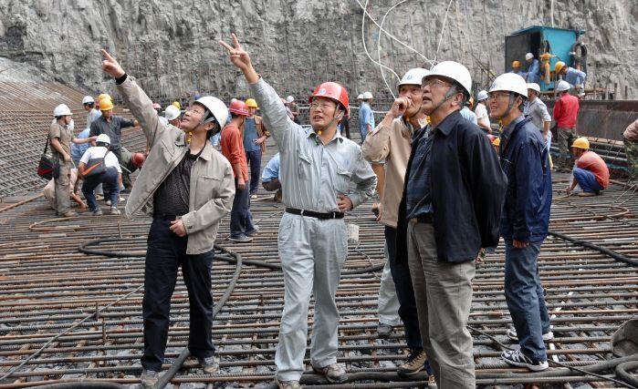 中國工程院院士、原三峽總公司總經理陸佑楣(左)和汪志林在溪洛渡建設現場討論。