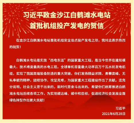 習近平致信祝賀金沙江白鶴灘水電站首批機組投產發電
